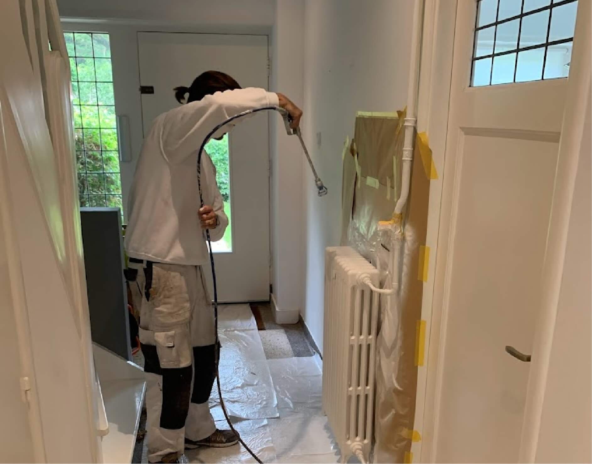 Vervolgens nemen we persoonlijk de tijd om de voorbereiding af te maken, inclusief het zorgvuldig afplakken en repareren van beschadigingen, om vervolgens de verf aan te brengen voor een perfecte, egale afwerking.